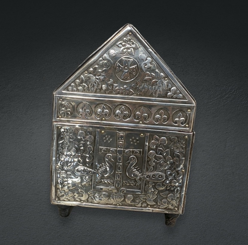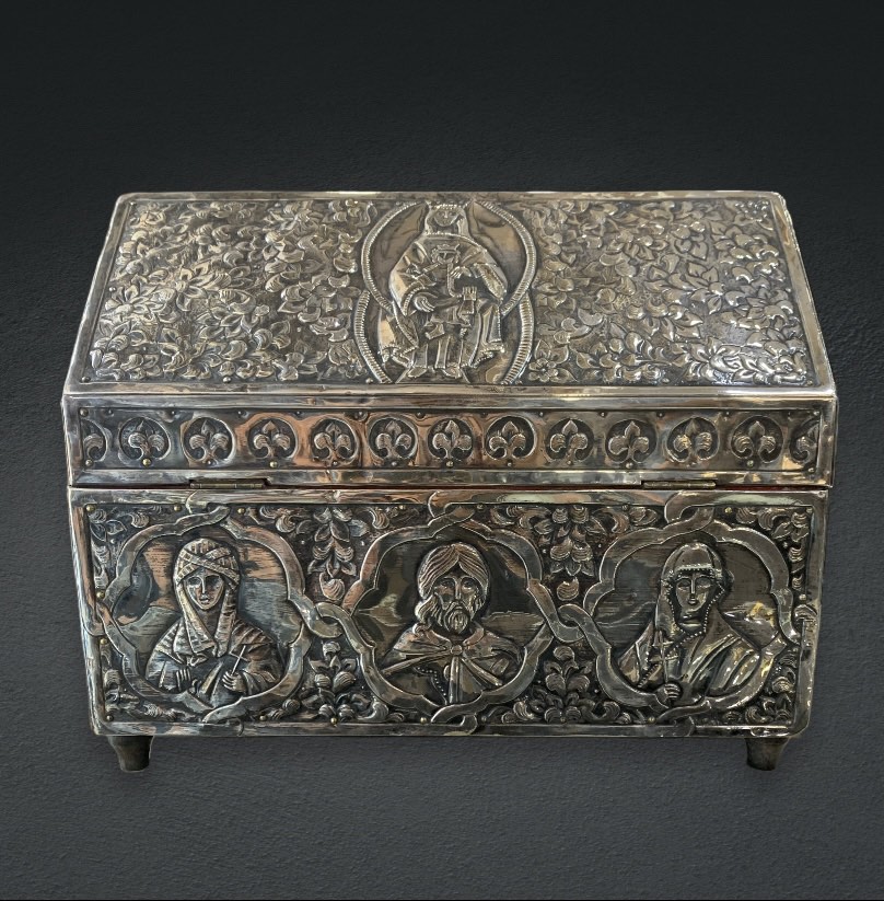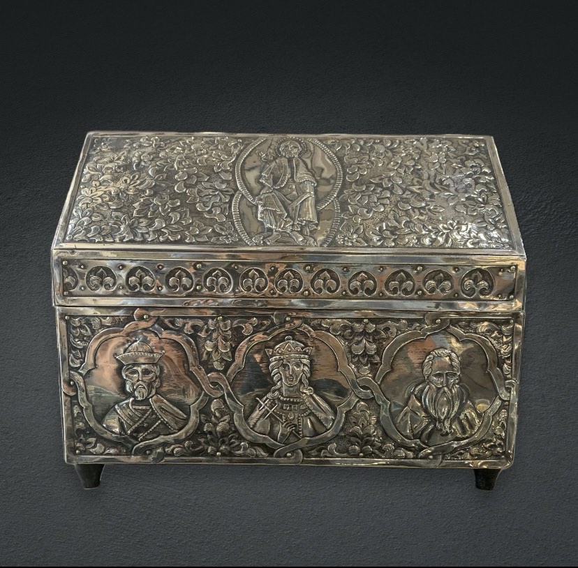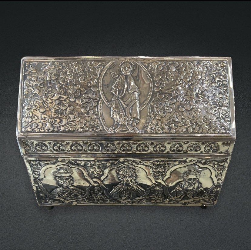 Ασημένιο κουτί 20ου αιώνα ,με θρησκευτικές παραστάσεις . Το εσωτερικό του είναι ξύλινο. Ιδανικό για ιερατικές χρήσεις , λειψανοθήκη. Διαστάσεις 22χ17 cm.