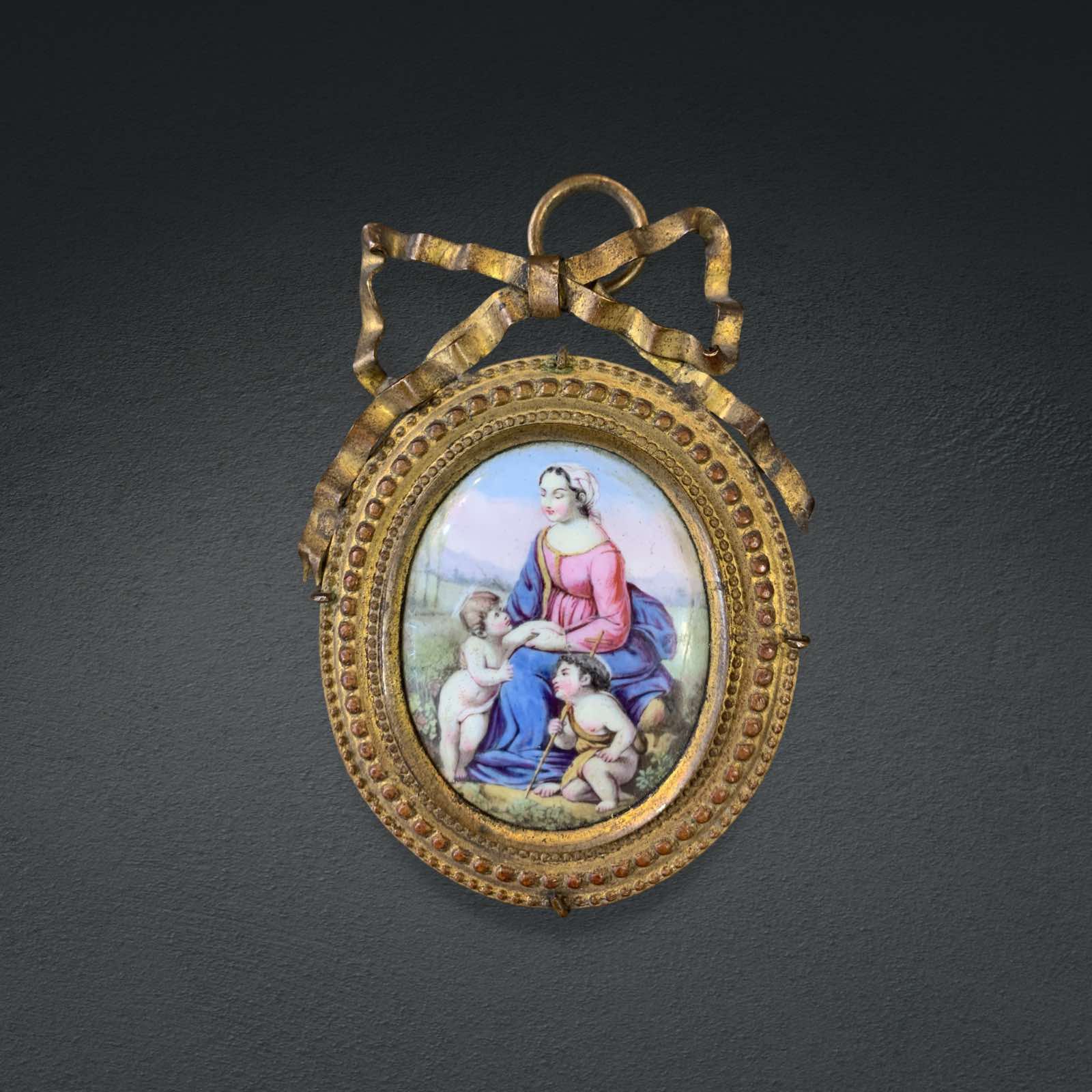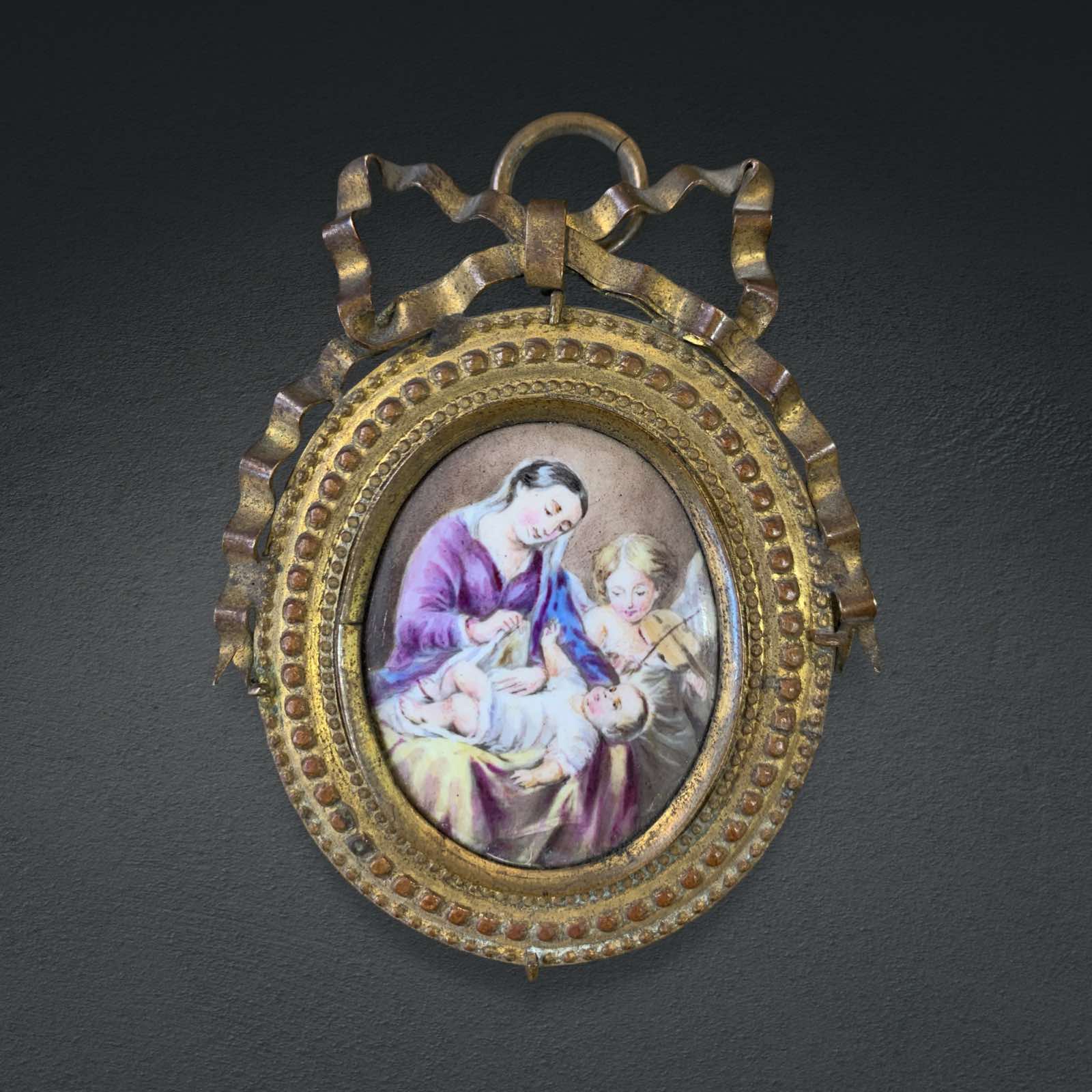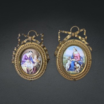 Δύο κορνίζες μινιατούρες που απεικονίζουν την Γέννηση του Χριστού και την Παναγία των αγρών με τον Χριστό και τον Ιωάννη τον Βαπτιστή σε νεαρή ηλικία . Στην παλαιά τους κορνίζα , διαστάσεις σμάλτα 3,8 Χ 3 cm , 4,2 x 3,3 cm. Ιδανικά για ιερατικά Σμάλτα , Εγκόλπιο , ιερατικές μίτρες .